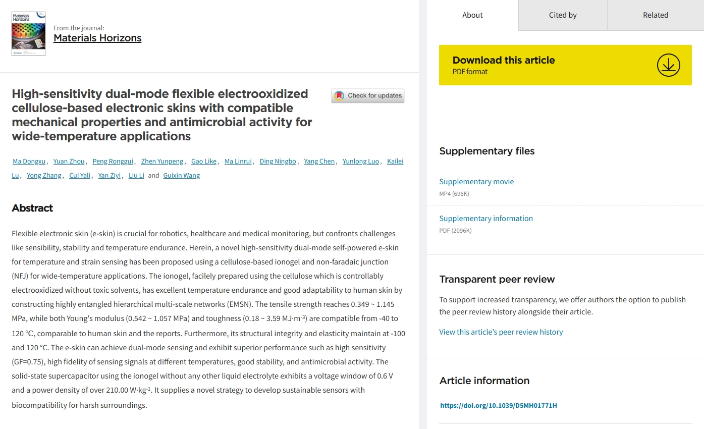 为了进一步提高固态电解质的柔韧性和温度使用范围,研究团队构筑了高度交织层级多尺度网状结构离子凝胶,在-100~120ºC有好的结构完整性和力学性能,将其与碳布组装成全固态超级电容器,在无添加任何液态电解液和无外界压力的情况下功率密度达到210.00 W·kg−1,经过5000次充放电循环后仍保持好的电极/电解质界面和电解质结构完整性。而且,该凝胶固态电解质也表现出好的应变与温度传感性能及抗菌性,为下一代快充电源和可穿戴自供电电子设备的开发提供了新策略。相关研究成果发表在《Materials Horizons》(//doi.org/10.1039/D5MH01771H)上,该论文第一作者为色情网址大全