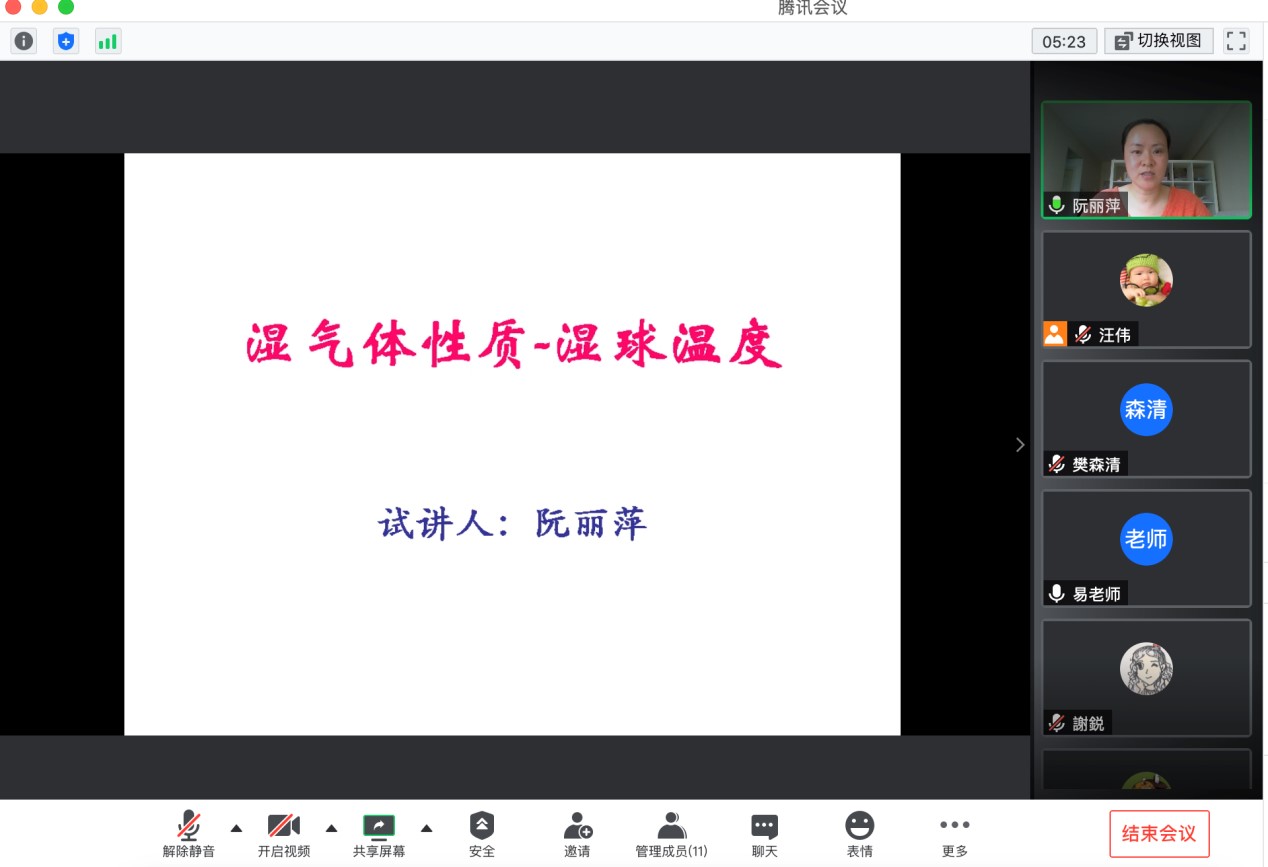 原理教研室的优良传统,旨在通过以经验丰富的教师带新教师的方式,进一步提升新进教师的教学业务水平。阮老师在本次教研活动中对“湿气体性质-湿球温度“的章节内容进行了试讲,获得了教研室老师们的一致好评。同时,易美桂老师、叶世超老师、杨雪峰老师等在阮老师所讲内容上进一步对课程知识点展开深入讨论,为年轻老师带来了独特的观点和深刻的启发。