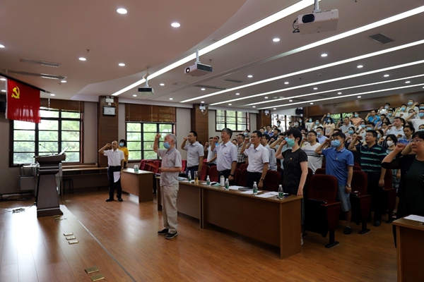 关心下一代工作委员会副主任、有63年党龄的老同志梁明征带领下,全体与会党员同志一起铿锵有力地宣读入党誓词、铭记共产党人的初心和使命!