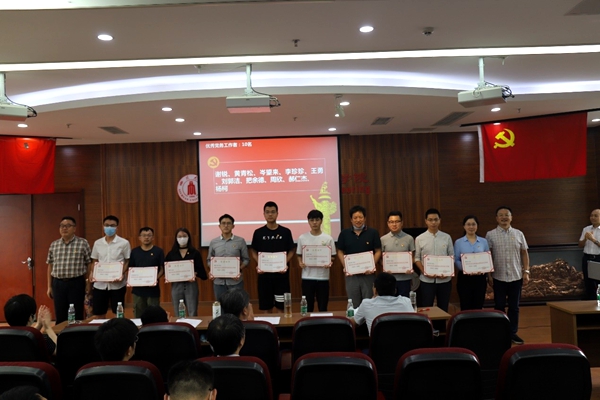 党委委员、工会主席穆畅道和专职组织员陈晓东为获得优秀党务工作者称号的同志颁奖。