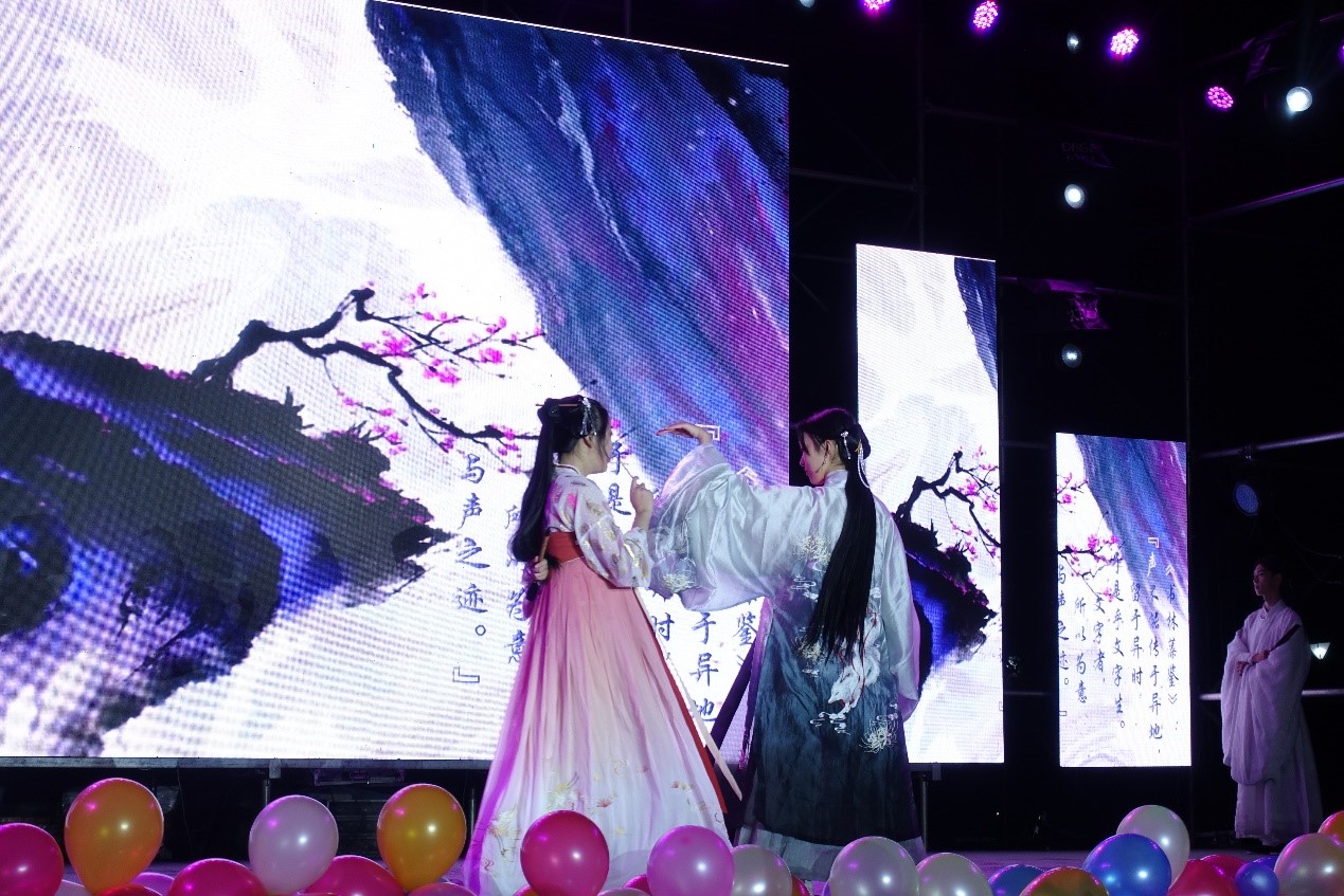 晚会共分三个篇章。在第一篇章“燃动青春”中,舞蹈串烧《burning dance》带观众领略了舞蹈百变多样的魅力。汉服走秀《诗礼乐赋成,华夏盛世长》将古色古香的诗意画卷铺展在观众面前,尽展华夏之美。由退休教师带来的民族舞《心上的罗加》展现了辽阔草原的迷人图景,舞动的身姿如白云飘过,跳动的脚步如青草摇曳。小品《新路转变》从开学报到、新生研讨课和宿舍夜谈三个熟悉的场景出发,生动地再现了新生们的别样生活。