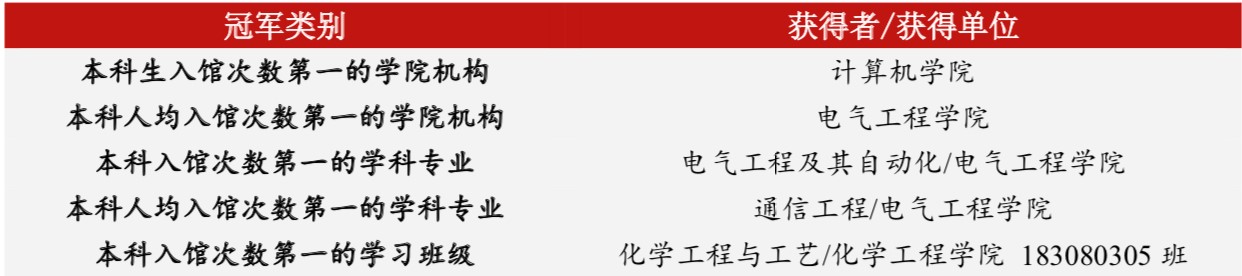 “明远学习榜”工科“本科入馆次数第一的学习班级”、“本科综合利用图书馆第一的学习班级”冠军榜。
