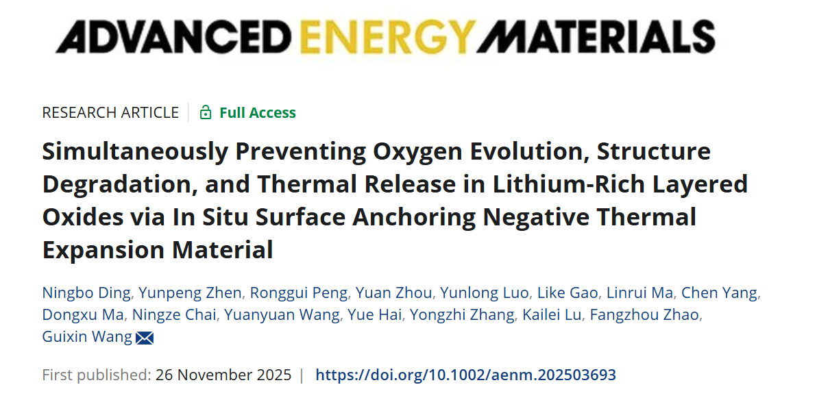王贵欣教授团队在《Advanced Energy Materials》期刊发表了题为“Simultaneously Preventing Oxygen Evolution, Structure Degradation, and Thermal Release in Lithium-rich Layered Oxides via in Situ Surface Anchoring Negative Thermal Expansion Material”的研究论文(//doi.org/10.1002/aenm.202503693)。该论文第一作者为色情网址大全