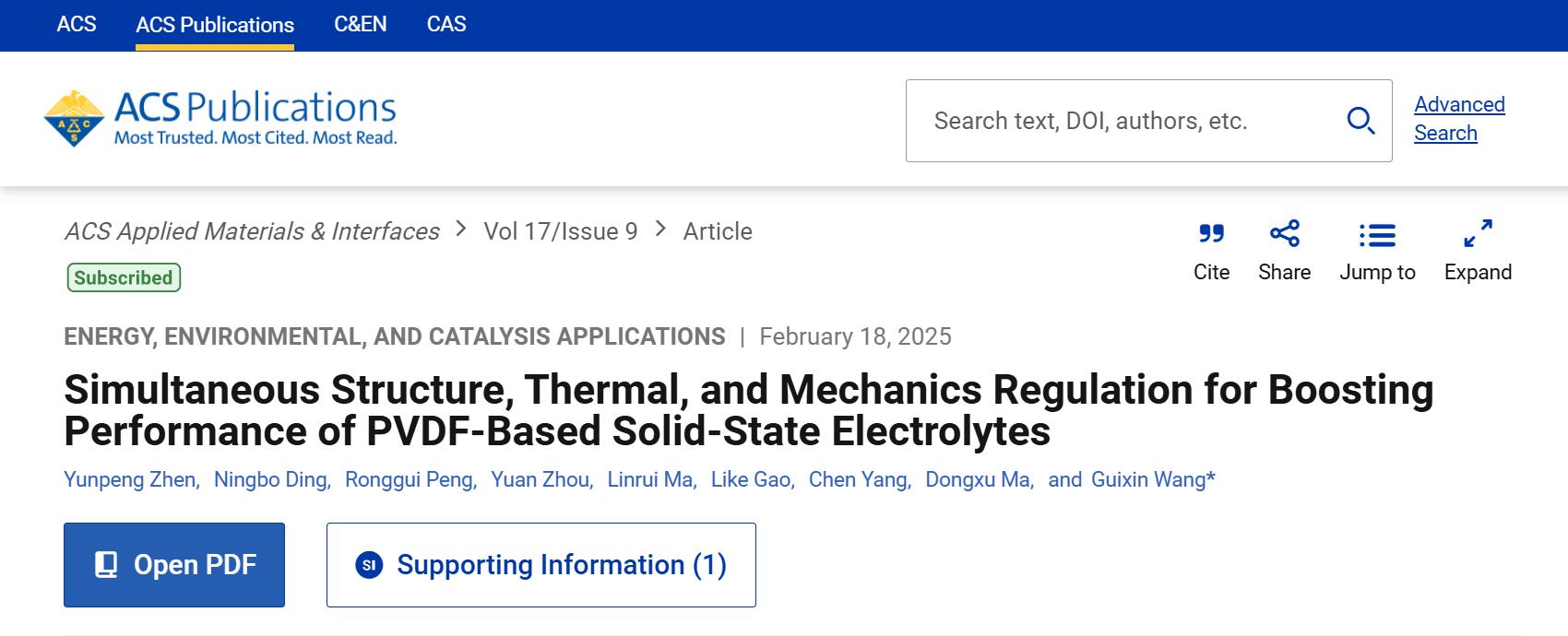 此外,在固态电解质领域,该研究团队基于结构、界面、热和力的协同调控机制,设计开发了负热膨胀材料LiZr2(PO4)3改性的PVDF基复合固态电解质,在不加任何液态电解液和压力的情况下,将制备的新型复合固态电解质与金属锂和不同正极材料组装成全固态电池并展现出好的性能(使用该电解质的Li||LiFePO4固态电池和Li||LiNi0.8Co0.1Mn0.1O2固态电池在25 ℃和0.5 C下的可逆容量分别为133.9和171.6 mAh/g,循环300次和200次后容量保持率分别为90.4和87.7%,循环300 h后的应变分别降低37.7和33.6%。而且,在大电流和高温下也有好的性能),为固态电解质的改性和低成本高性能固态电池的应用提供了新策略和新进展。相关研究成果发表在《ACS Applied Materials & Interfaces》(//doi.org/10.1021/acsami.4c22175)上,该论文第一作者为色情网址大全