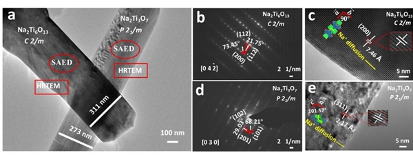 由于环境污染日益严重,众多学者提出运用可再生能源储存技术储存绿色,清洁的能源。近些年,锂离子电池已在电子设备、电动汽车等领域取得重大的突破和发展。鉴于锂资源储量有限和价格攀增,以及考虑到钠资源全球分布广泛及价格低廉,钠离子电池有望取代锂离子电池,并在未来储能领域有大规模的发展。钛酸钠材料具有良好的储钠活性,高循环稳定性,低电压平台和成本,无毒等优势成为目前钠离子电池负极材料的研究热点。作为钛酸钠材料的代表之一,层状结构Na2Ti3O7 材料能脱嵌2个Na,其理论比容量和电压平台分别为177 mAhg-1和0.3 V左右,能提供较高的能量密度。然而,该材料电导性较差,离子传递速率慢以及在脱嵌钠过程中结构发生扭曲导致差的循环性能,严重制约了其发展和应用。隧道结构Na2Ti6O13材料作为钛酸钠材料另一代表,具有高离子电导性,优良的循环稳定性和低电压平台等优点,但其储钠能力较低,导致低的比容量。如何发挥层状Na2Ti3O7和隧道Na2Ti6O13材料各自的优点,并同时避免各自的缺陷,成为研究目标。