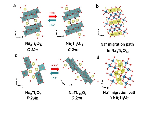 图 5. 在脱嵌钠过程中层状和隧道示意图: a) 隧道Na2Ti6O13; c) 层状Na2Ti3O7; 模拟的钠离子传输路径: b) 隧道 Na2Ti6O13; d) 层状 Na2Ti3O7