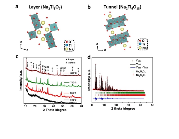 图 1. 晶体结构示意图: a) 层状 Na2Ti3O7, b) 隧道Na2Ti6O13; c) 不同温度复合结构的XRD; d) 煅烧 850°C 复合材料同步辐射精修图