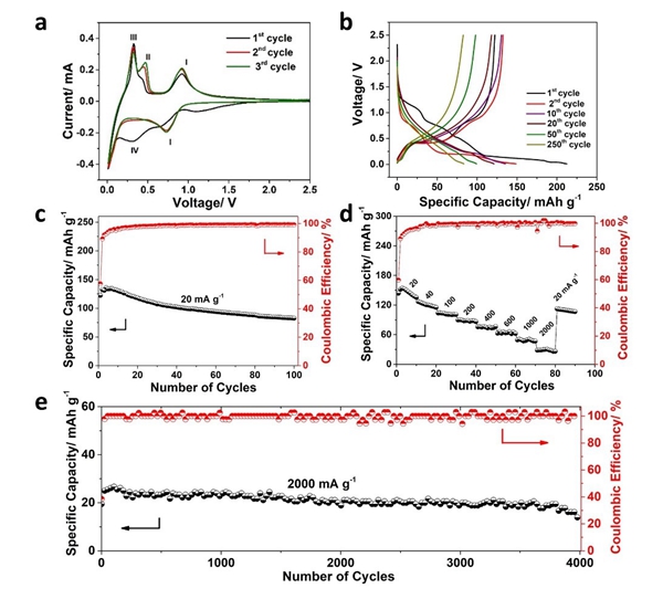 图 3. a) 在扫描速率为 0.2 mVs-1下电极材料的CV图; b) 在电流密度为 20mAg-1下充放电曲线; c) 在电流密度为 20mAg-1下复合材料循环性能; d) 在不同电流密度下倍率性能 e) 在电流密度为 2000mAg-1下 循环图