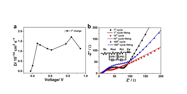 图 6. a) 在电流密度为0.02 mA下第一圈充电状态下GITT; b) 在不同充电状态下不同循环复合电极的EIS图 (内嵌: 等效电路图)