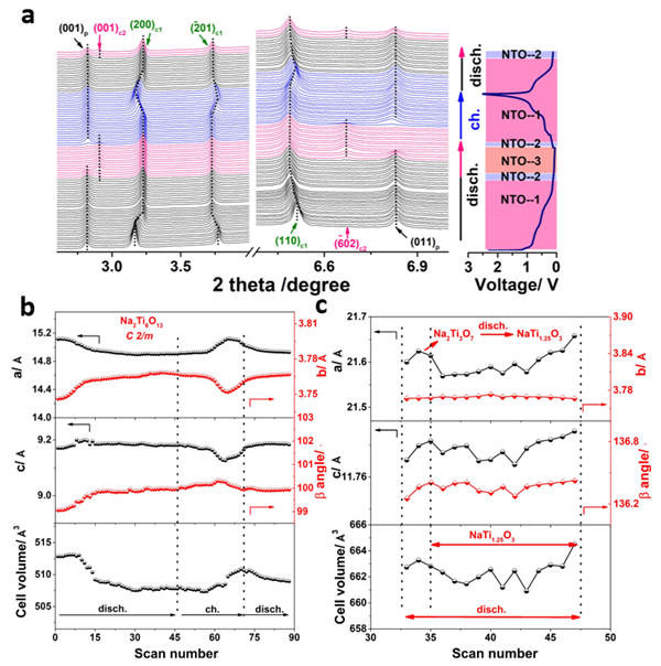 图 4. a) 低角度原位XRD和不同相的晶面:Na2T3O7 (下角标 p 和黑色); Na2Ti6O13 (下角标 c1 和橄榄色); NaTi1.25O3 (下角标 c2和粉红色); 充放电过程中不同组分晶格参数的相关变化: b) Na2Ti6O13; c) NaTi1.25O3