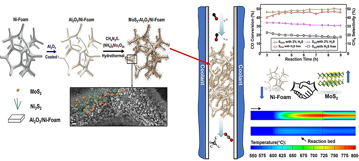 同时,研究团队还开发了MoS2-Al2O3/Ni-Foam钼基泡沫结构整体式催化剂用于工业耐硫甲烷化反应,以强化传热传质过程,缓解反应过程中因反应放热引起反应问题不均与反应稳定性差的问题,结合CFD模拟计算证实了该催化剂能够促进甲烷化反应过程的高热量及时移除,避免了催化剂床层热点的出现,提升了反应的稳定性与催化剂抗高温烧结的能力。