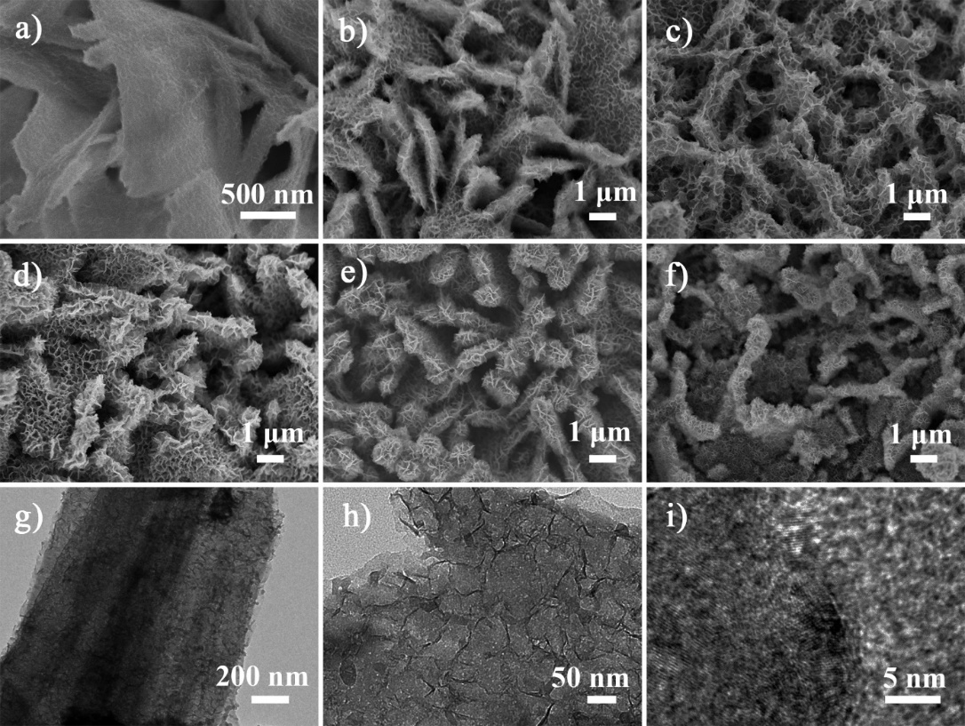 图2. a-f) 不同浓度PPy包裹的MnCo2O4/GNF复合材料SEM图;b) PPy@MnCo2O4纳米片表界面PPy垂直交叉片TEM图。