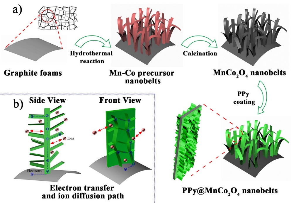 图1. a) PPy@MnCo2O4/GNF复合材料合成图;b) 电子/离子迁移路径示意图。