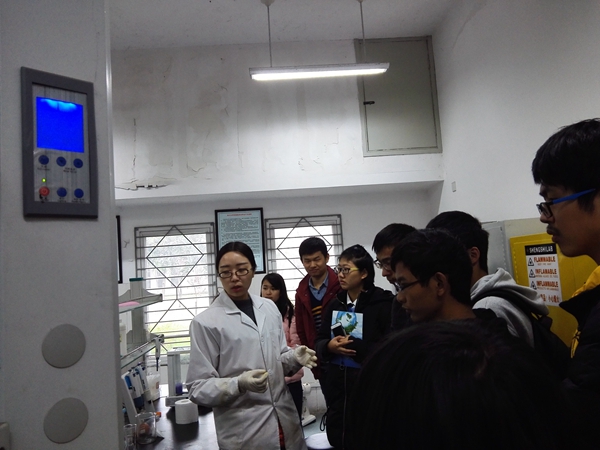 林翔和魏竭老师带领生物工程和制药工程专业的同学参观了制药和生物工程专业实验室,向大家展示了实验室发酵装置、超声提取装置、合成实验反应釜和药物合成数据监测系统等制药设备。林老师结合如芦丁提取实验等本科实验,向大家简要阐述了这些设备的用途及工作原理。魏老师向大家介绍了洁净工作间的基础设备,发酵实验室的自动发酵设备和卧式压力蒸汽灭菌器。