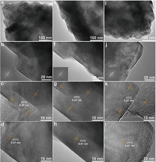 图2.a, b)LMO-HF正极材料的TEM和HR-TEM图。c, d)LMO-HF正极材料在不同位置的放大HR-TEM图。e, f)LMO-HF正极材料不同位置的TEM和HR-TEM图。g, h)LMO-HF正极材料在不同位置的放大HR-TEM图。i, j)LMO-HF正极材料不同位置的TEM和HR-TEM图。k, l)LMO-HF正极材料在不同位置的放大HR-TEM图。