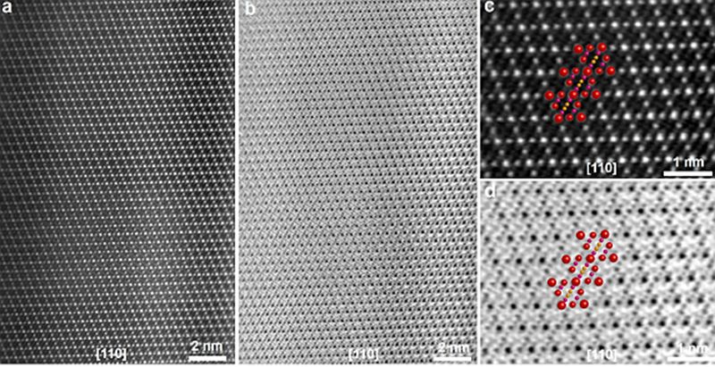 图4.a,b)LMO-HF正极材料沿[110]带轴的HAADF和ABF-STEM图。c,d)LMO-HF正极材料沿[110]带轴放大HAADF和ABF-STEM图以及相应的原子结构模型。