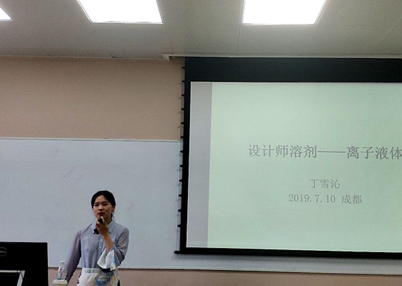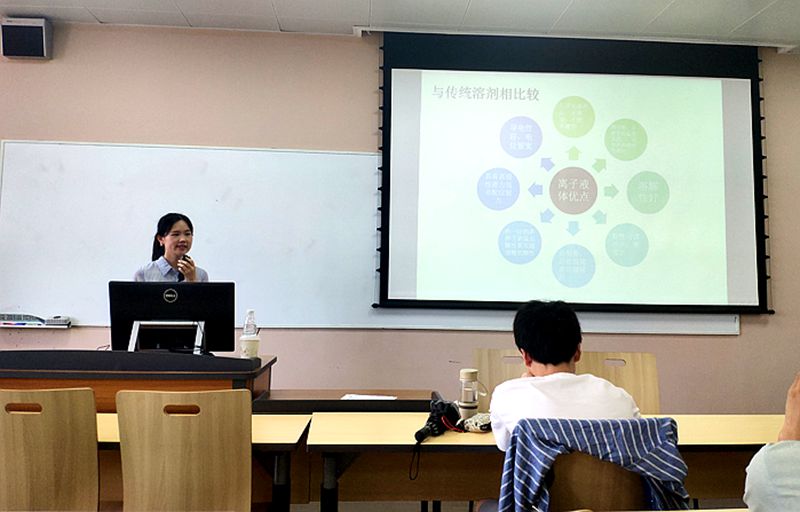 的丁雪沁老师为制药工程与生物工程的同学们讲授设计师溶剂-离子溶液的相关知识内容。