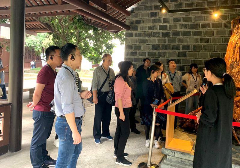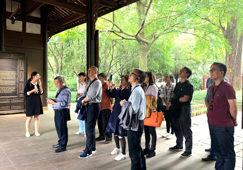 同志们先后参观了三苏塑像、启贤堂、古井、荔枝树、来凤轩、百坡亭、披风榭、连鳌山和洗砚池等处。三苏祠博物馆的解说员在现场向同志们详细介绍了苏洵、苏轼和苏辙三父子在历史上的政治、文学以及廉政为民的相关事迹。三苏祠因三苏父子而享誉中外,三苏父子以其卓越的创造才能和辉煌的文学成就,同登“唐宋八大家”之列,千古文章辉耀古今,三苏在文学上造诣极深,人称“凝炼老泉,豪放东坡,冲雅颍滨”。三苏父子立身操守,光明磊落,廉洁自律,关心国家命运,同情民间疾苦,为老百姓办实事、谋福利。