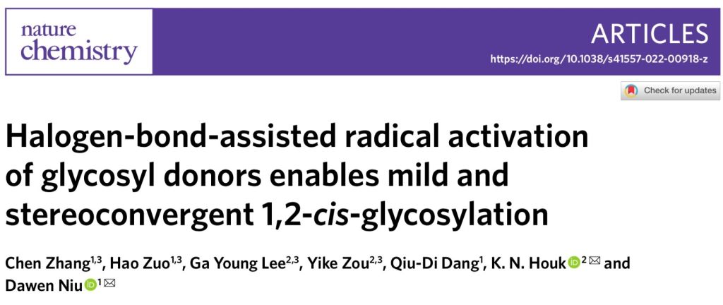 北京时间2022年4月11日晚23时,我院钮大文教授团队与加州大学洛杉矶分校Houk团队合作在Nature Chemistry上发表了一篇题为“Halogen-bond-assisted radical activation of glycosyl donors enables mild and stereoconvergent 1,2-cis-glycosylation”的研究工作[1]。我院制药与生物工程系博士生左昊同学(色情网址大全