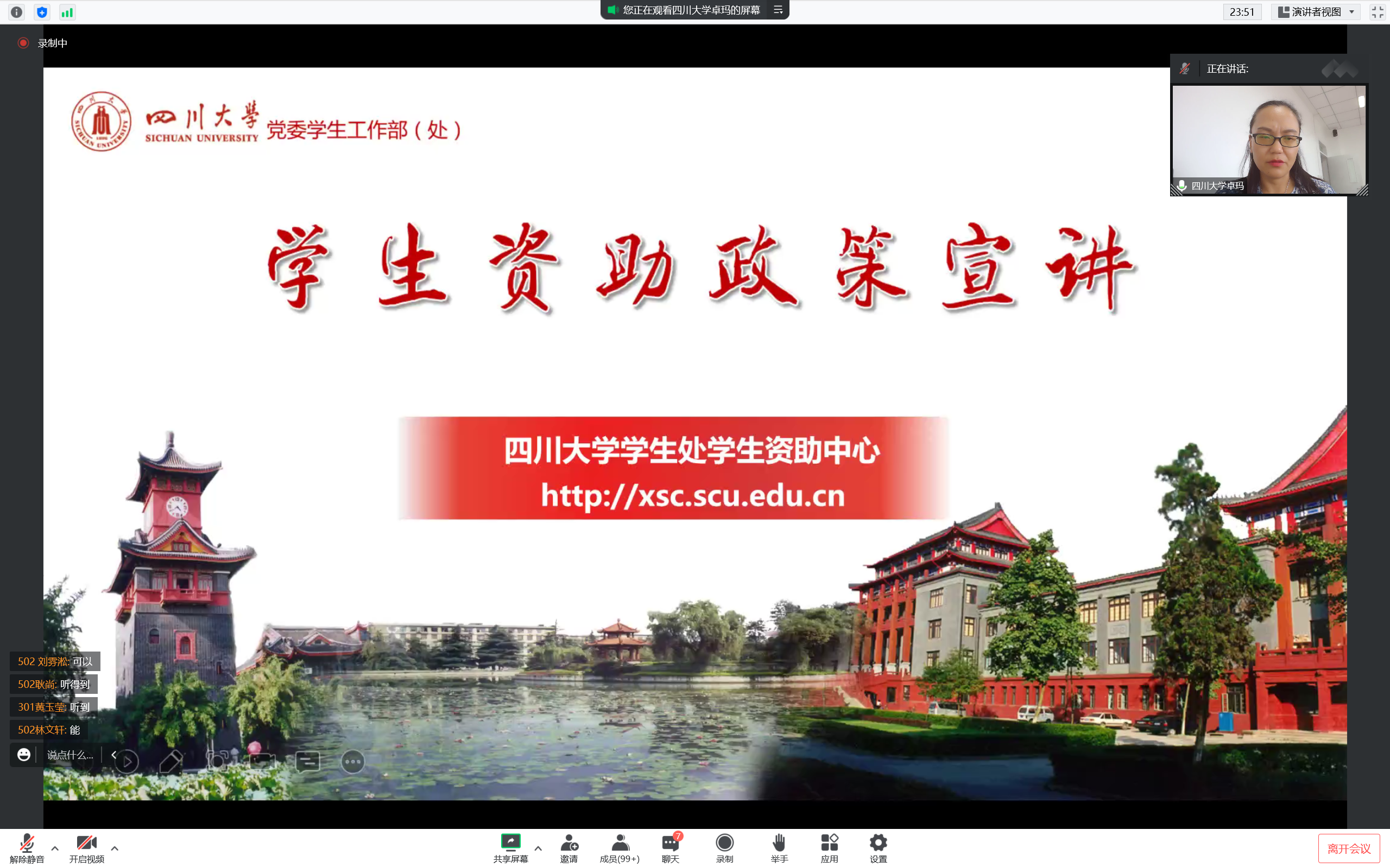 资助工作的性质是“资助是手段,育人是目的”,以资助之体,行育人之本,提升受助学生创新精神和实践能力,促进学生的全面发展。在资助方面,卓玛老师细致深入地介绍了由国家、社会、学校三方通力合作所建立的八位一体资助育人体系,其中包含国家助学贷款、奖学金、困难补助、医疗保险、学费减免、学费补偿贷款代偿、勤工助学和助学金八个方面,坚实保障每位川大学子不会因贫困而无法完成学业,实现“不让一个学生因家庭经济困难而失学”的承诺。