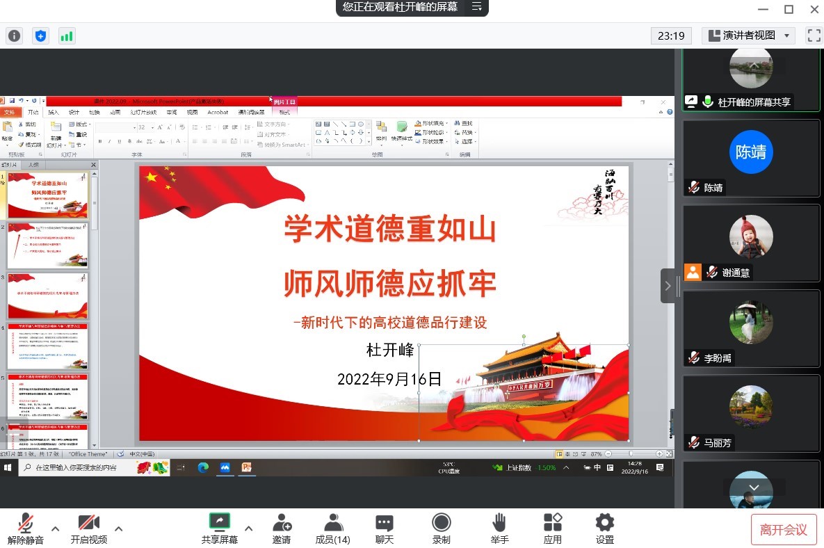杜老师首先带领大家学习了教育部制定的《高等学校预防与处理色情网址大全行为不端行为办法》文件精神,接着分享了高校师风师德建设和警示相关的典型案例,最后结合《中国共产党章程》,对于严肃党风党纪,恪守清正廉洁,以及高校教师要做好党风廉政建设和保持良好的师风师德的重要性和要求进行了阐述。