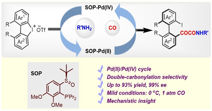 原料,如烯烃、烷基或芳基卤化合物等,转化为醛、醇和羧酸衍生物等高价值产品。然而,经典的钯催化(零价/二价钯催化循环)羰基化,在实现高收率、高化学选择性、高区域选择性以及对映选择性等方面依然面临巨大挑战。针对此问题,廖建教授团队经过不懈努力,发展了一种以手性亚砜膦/钯络合物为催化剂,通过高价钯催化途径的不对称胺羰化新策略。