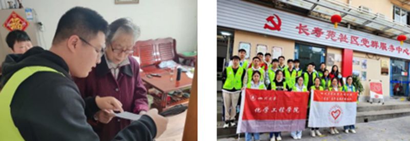 志愿者入户问卷调查并在社区党群服务中心前合影
