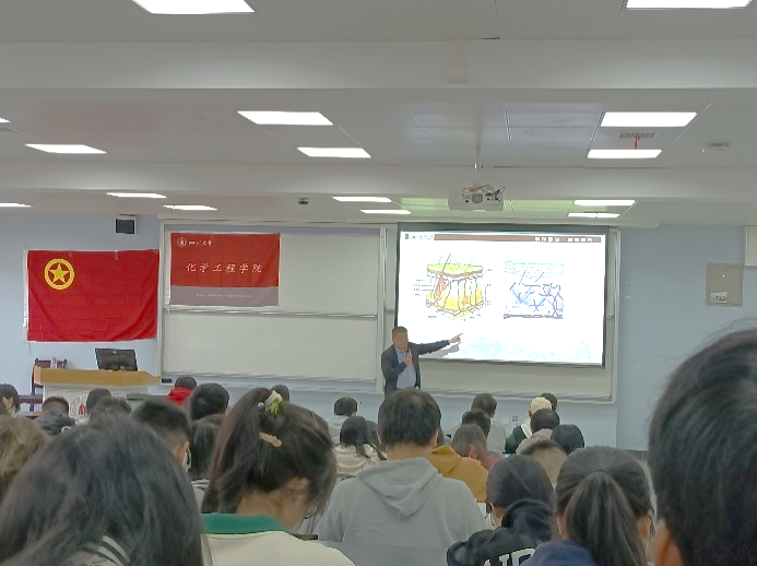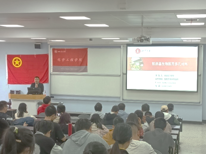 接下来,李德富教授为同学们详细介绍了胶原基生物医用多孔材料。为了培养同学们的科研思维,李教授讲解了从发现实际生活中的问题到提出设计胶原基生物医用多孔材料,再到测试材料性能,最后应用到实际生产生活之中的科研历程,深入浅出地讲解了自己团队设计胶原基生物医用多孔材料的过程。