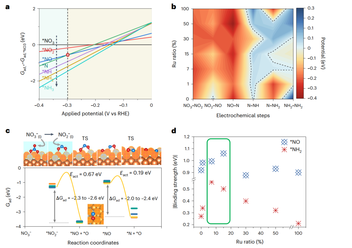 该理论模拟工作主要采用密度泛函理论(DFT)计算解析了RuCo合金催化剂上的硝酸盐电化学合成氨过程。首先,系统的模拟了反应相关物种可能的表面吸附状态,基于此,绘制了RuCo合金催化剂上硝酸根电化学还原反应过程中表面物种Gibbs自由能的热力学相图、表面基元反应热力学驱动力与过电位及合金中元素比例的相图。研究结果推断出硝酸根电还原过程中的过电位控制步骤为*NO到*N的转变,并发现含N-O键断裂过程的基元反应如果经由电化学过程发生,所需过电位远大于实验测试值,从而验证了耦合催化/电催化的三步接力催化过程的必然性。之后,对基元反应相图中存在的控制步骤进行了动力学分析,结果表明该过程存在N-O键断裂的可行化学步骤,过渡态构型指出在合金表面上Ru1Co3四原子团簇为最高活性位。最后,模拟结果发现*NH2和*NO的吸附能随合金比例变化存在火山形曲线,顶点区域对应合金比例与实验中电化学活性最高的合金比例相吻合。