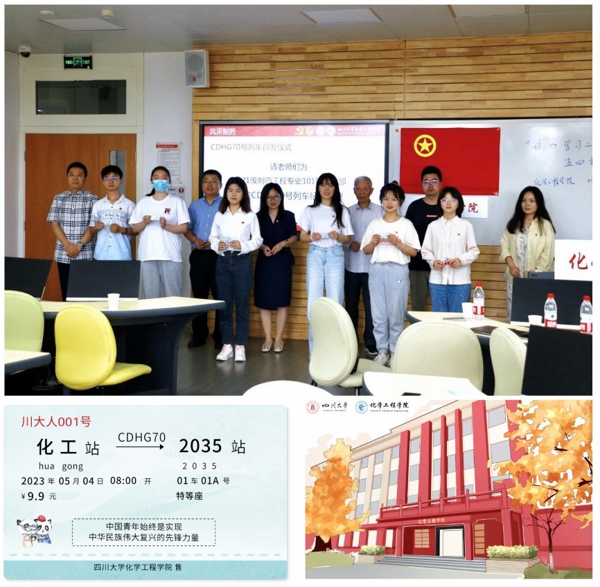 为起点,未来在制药领域中大放光彩!全体老师上台为2021级制药工程专业101班团支部全体成员发放CDHG70号列车纪念车票。