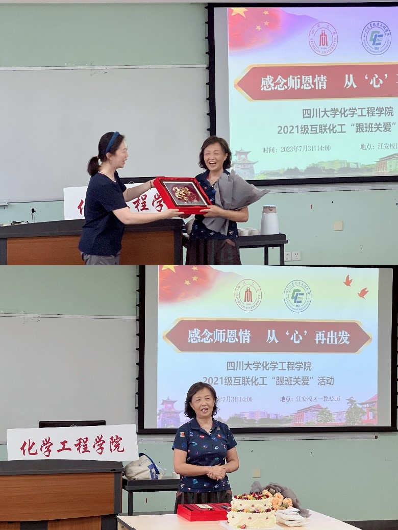 为李川娜老师送上荣休礼物,学生代表周一山和李佳向李川娜老师献上献花和贺卡,代表全体同学再次向李川娜老师表达美好的祝愿。