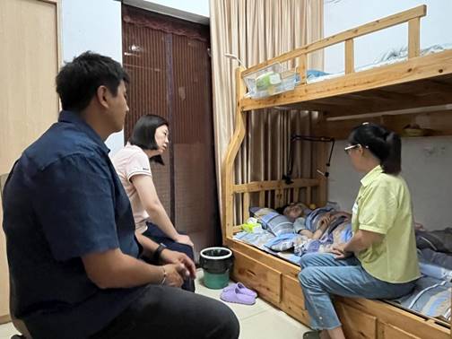 501班彭曦同学的宿舍,与彭曦及其母亲进行交流,询问其生活是否还方便,还有哪些需要帮助的地方。彭曦同学幼时被诊断为肌无力,被判定为三级肢体残疾,初中时发现患有脊柱侧弯,开学前进行了矫正手术。学校在了解相关情况后第一时间为彭曦及其母亲安排了单独的宿舍,方便彭曦更好的度过手术恢复期。