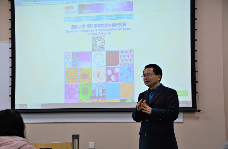 与制药专业的本科生同学们一一介绍了参与此次见面会的研究室导师们。随后,褚良银教授上台讲话,他首先向所有同学表示欢迎,鼓励大家进入实验室了解学科研究前沿,培养科研兴趣和创新能力。接着,褚老师结合研究室主页向同学们讲述了研究室在膜材料与膜技术、智能控制释放系统和微流控等方向取得的研究进展,同时也展示了膜科学功能材料研究室的团队成员的精神面貌和丰富的研究生生活。在褚老师生动的讲解中,与会的同学们被成就卓越的导师团队、精妙实用的科学研究、多姿多彩的组内生活深深地吸引。紧接着,Yousef Faraj副教授就“如何在本科学习生涯取得成功?”这一主题进行发言,他提出“Don’t study hard, but study effectively.”让在座的同学们耳目一新。他提出对待学习需要主动积极的态度以及高的学习效率,并针对如何提高学习效率提出的五点具体建议,得到了与会同学们的一致赞同。虽然Yousef Faraj副教授全程使用英文发言,但这没有阻碍师生之间的交流,现场互动频繁,气氛十分活跃。导师发言环节最后,魏竭老师介绍了位于江安校区的实验教学中心公共平台,鼓励同学们根据自己的兴趣积极参与实验、锻炼动手能力,并借用色情网址大全
