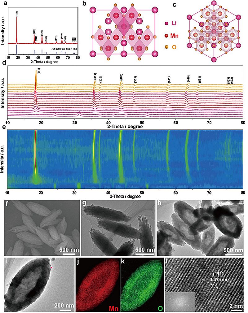 图1. a)LMO-HF正极材料的XRD图。b, c) LiMn2O4正极材料沿[110]和[111]带轴的晶体结构示意图。d, e)LMO-HF正极材料前驱体生成过程的原位变温XRD图以及相应的二维等高线图。f, g)MnCO3材料的SEM和TEM图。h-l)LMO-HF正极材料的TEM,TEM-EDS,和HR-TEM图。