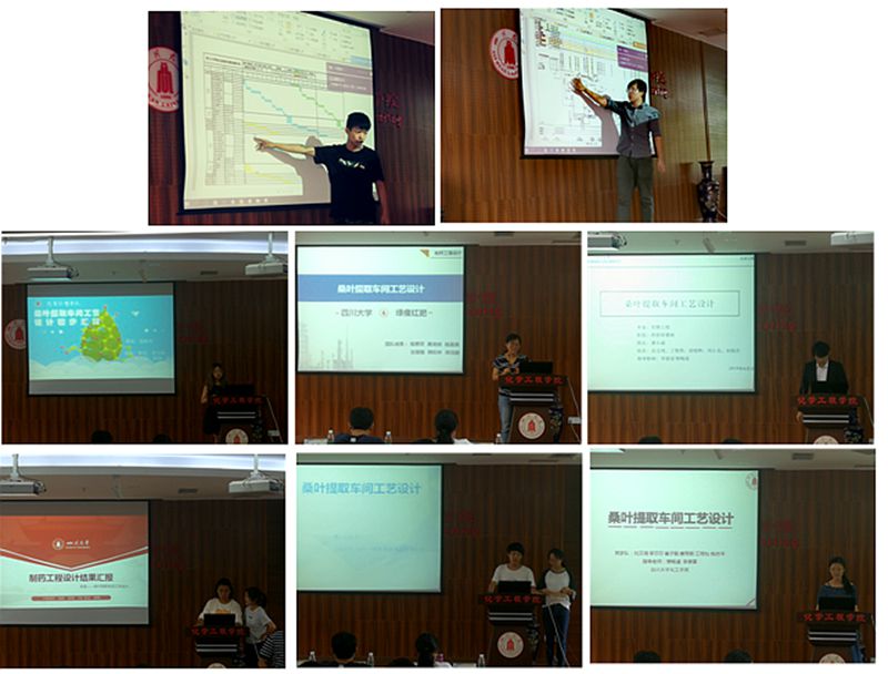 随后,参与此次竞赛的八个小组分别对题为《桑叶提取车间工艺设计》的设计内容进行了全面展示,从桑叶提取设计任务出发,进行工艺流程的设计,通过查询相关参数进行物料和热量衡算,再到设备选型并进行带控制点的工艺流程图和设备分布及厂房设计图的绘制,最后以环境和经济分析完成整个设计。每一组都立足于自己所学知识,通过师生讨论,做出了一份完整的设计。各位评委老师对各组的设计内容进行了充分的肯定,并提出了指导性建议,根据往年比赛情况,对设计的科学性、先进性以及合理性提出了一些有针对性的见解,指出了各小组在工艺流程设计和工艺流程图及厂房设计图绘制上存在的问题,并提出了修改意见。通过与评委老师的交流,各参赛小组对设计内容有了更加充分的理解,为下一步西部区域赛和国赛做好了准备。