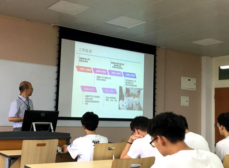贺教授是重庆大学创新药物研究中心主任。此次授课,贺耘教授依照“工作经历、专业内容、创新发展、自由讨论”的思路,让学生们享受到了趣味十足而收获满满的课堂学习。
